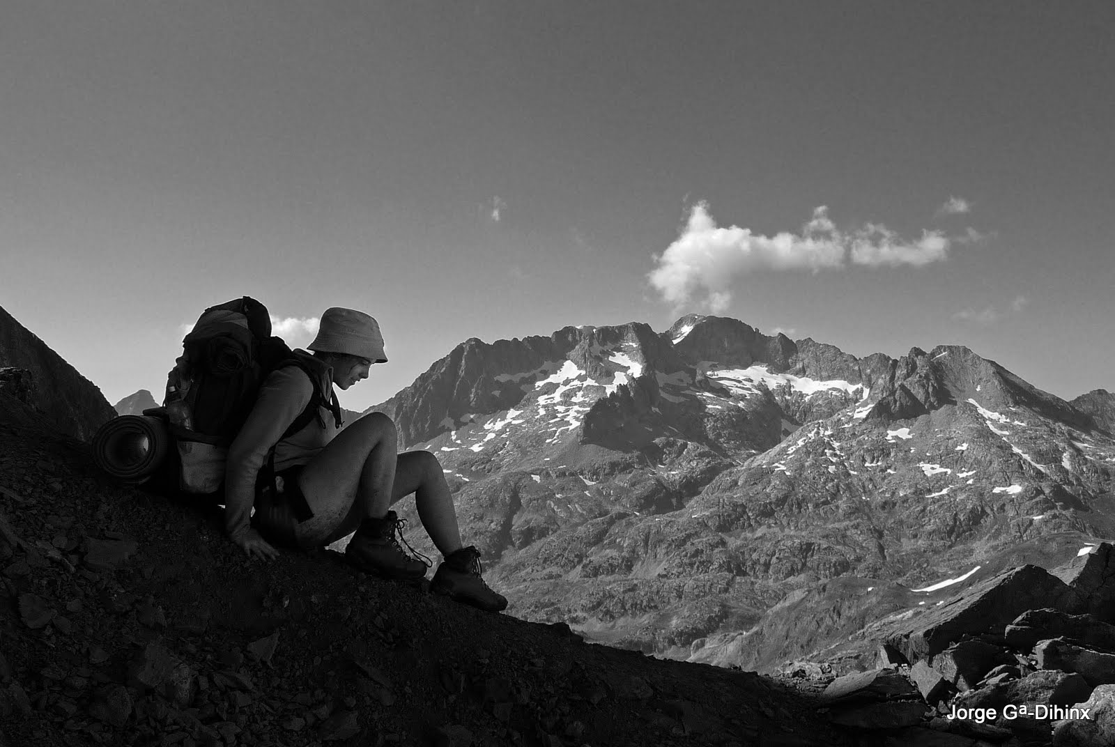 Me dedico a recorrer el filo divisorio de aguas entre el Ara y el Gállego, yendo hacia el sur, que me llevará a la cima del Pico Ferreras. Esta bella pirámide preside desde lo alto el circo del ibón de Catieras. Poco conocida, esta montaña es un gran mirador erguido en la divisoria del Ara y el Gállego. Desde su cima, abajo el ibón de Catieras me llama para darme un baño, así que allí iré. Luego volveré pasando por la cima del Pico Mallaruego y recorriendo el suave y verde valle de Ordiso para regresar de nuevo a Bujaruelo.