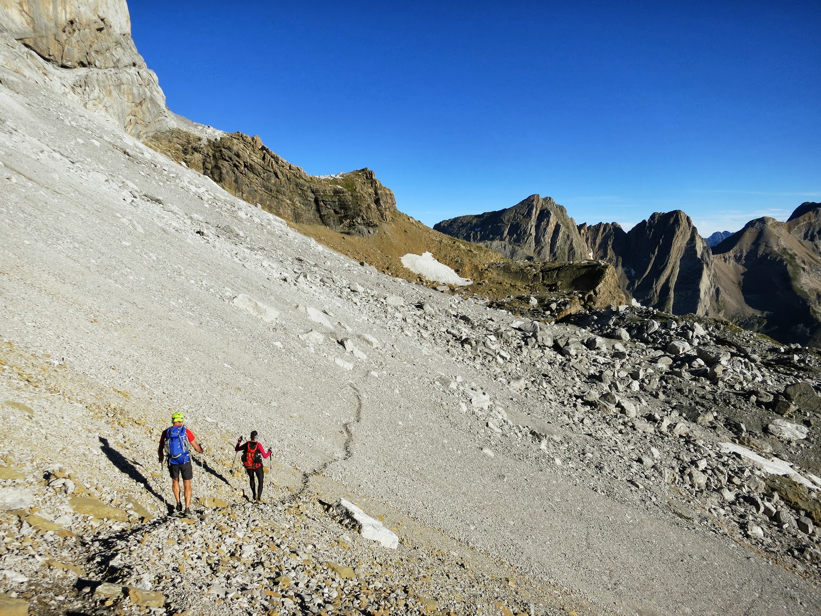 Nosotros tuvimos que tirar de imaginación e improvisar un escape por la roca, para poder evitar la nieve. No fue sencillo, teniendo que destrepar con pasos de II con cierta exposición para terminar en la base de la nieve. Ufff... el último escollo del día estaba por fin salvado.